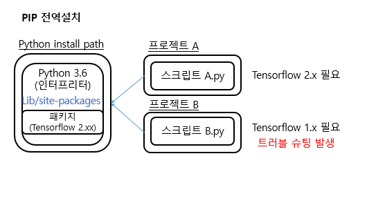 - A 프로젝트 B 프로젝트를 왔다 갔다 하며 진행 시 tensorflow 버전을 항상 바꿔줘야 하는 난감한 상황이 발생하였다.